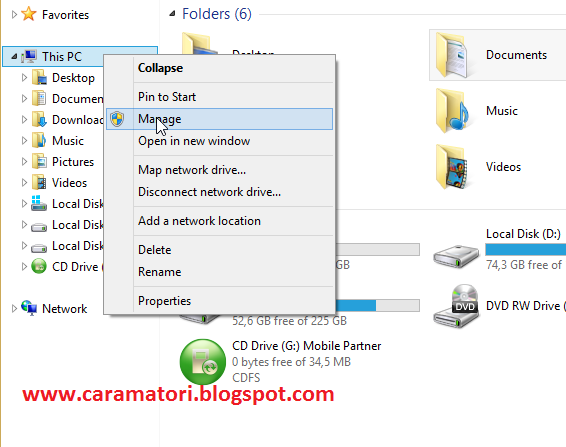 1. klik kanan di MY COMPUTER atau This PC lalu pilih Manage seperti di gambar berikut ini